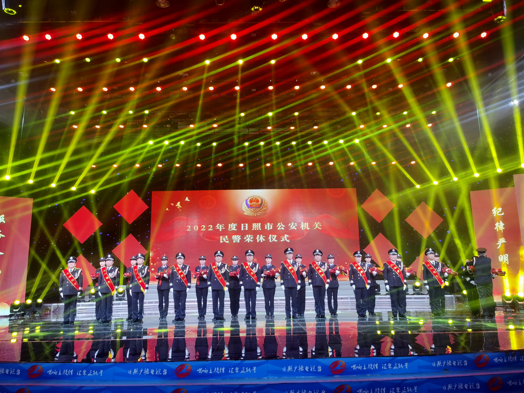 當天19:00,在日照廣播電視臺演播大廳,隆重舉辦了報告演出。日照市副市長、公安局局長李剛致辭。會上隆重舉行了2022年度警銜晉升儀式、2022年度民警榮休儀式、表彰了“人民滿意的派出所”等先進集體,中間通過精彩的節目,生動地將反詐騙、刑偵偵察、維護交通秩序等呈現在舞臺上,展現了日照公安為人民的良好作風,同時也讓廣大市民了解各種法律法規知識,并起到了很大的反響,并紛紛表示在生活、工作中,一定會根據匯報內容,做好宣傳工作,普及法律法規知識。
